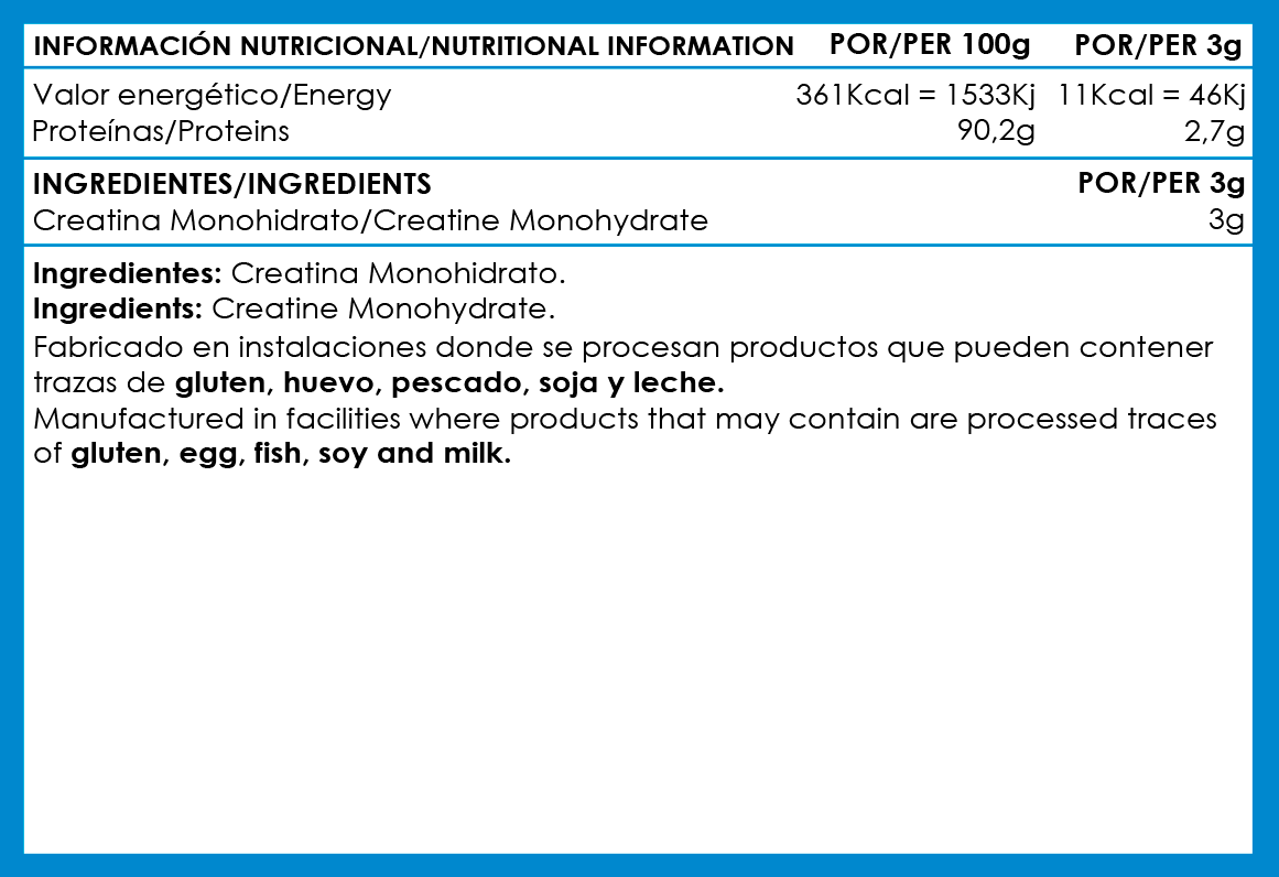 MODO DE EMPLEO: Añadir 3g de producto (3/4 cacito) a 200ml de agua y remover. No consumir más de 1 dosis diaria debido a su contenido en creatina monohidrato.