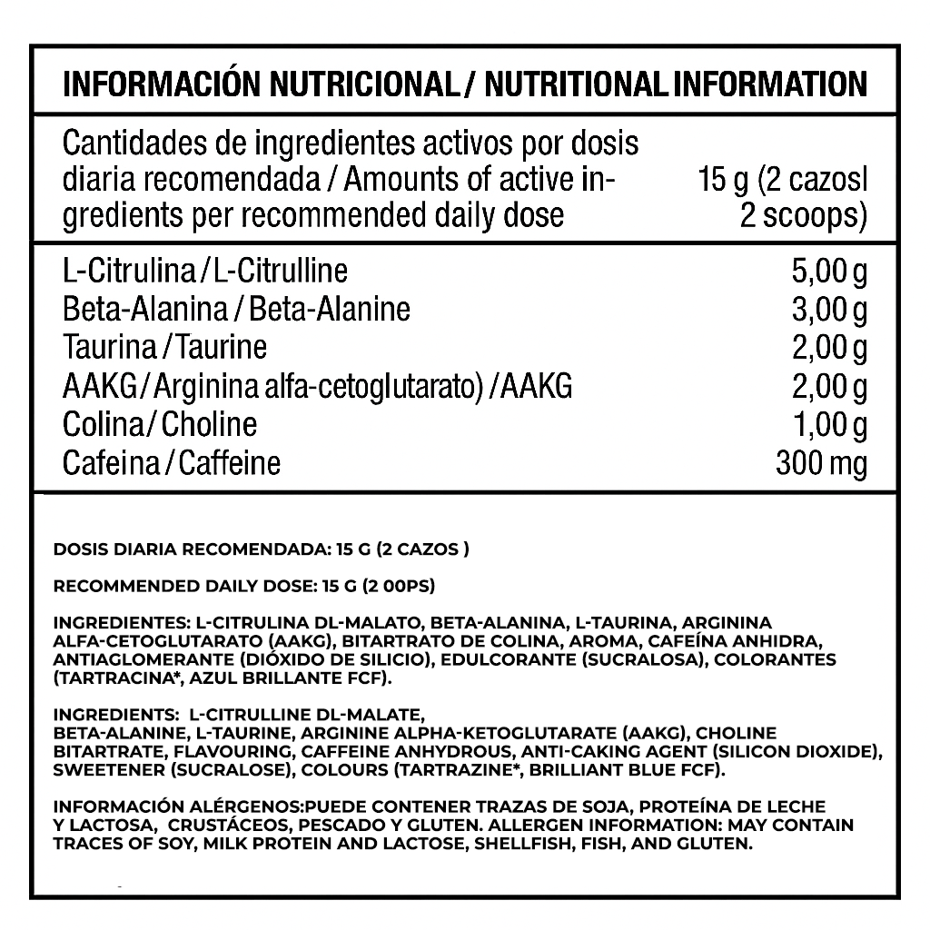 Su fórmula avanzada combina ingredientes clave como L-Citrulina, Beta-Alanina, Cafeína y AAKG, que actúan en sinergia para ofrecer una energía explosiva, una congestión muscular intensa y una concentración mental inquebrantable durante todo el entrenamiento.